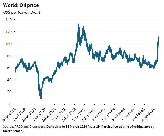 The war in the Middle East is now deep into its third week, with the oil price back above US$100/barrel (Brent) and at the time of writing pushing past US$110/b. Price pressures are likewise mounting across a
