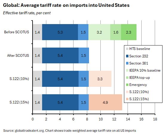 The rapid introduction of Section 122 tariffs quickly changed this picture, with the ultimate outcome dependent on whether the recently introduced 10 per cent rate is the new normal or if a 15 per cent rate ultimately becomes the new baseline. According to revised estimates from Global Trade Alert, the new measures increase the trade-weighted average tariff from 8.3 per cent to either 11.6 per cent (assuming a ten per cent surcharge) or 13.2 per cent (in the case of a 15 per cent rate).